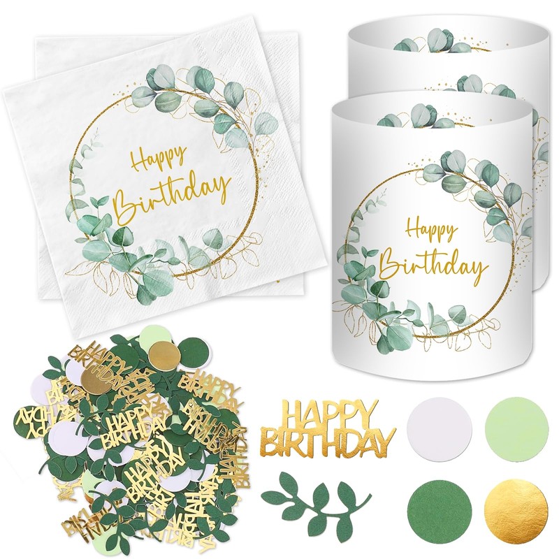 Pack of 20 Napkins Happy Birthday + 12 Pieces Lantern Table Decoration Birthday + 100 Pieces Confetti Birthday Decoration Green Birthday Decoration Woman Man Girl Boy Children Eucalyptus Table