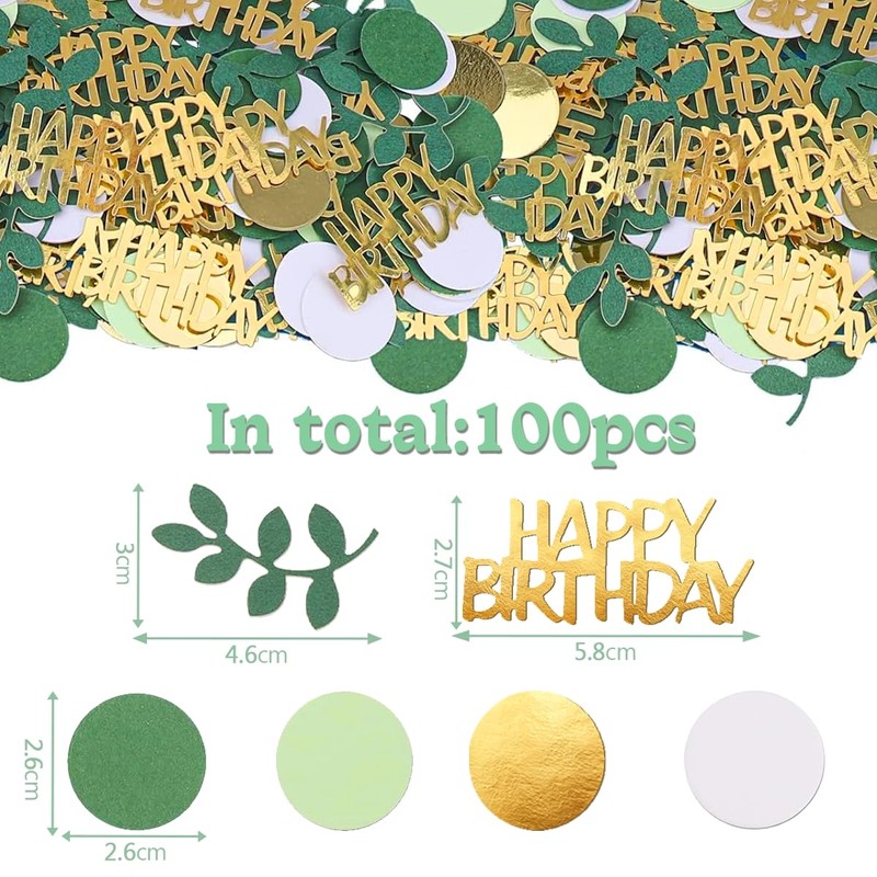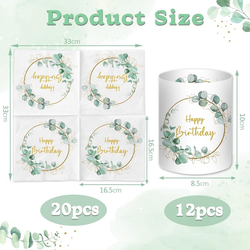 - Table decoration for birthday: Includes 20 green eucalyptus napkins Happy Birthday + 12 pieces lantern table decoration birthday + 100 pieces confetti birthday decoration, the motif napkins are open 33 x 33 cm. In the pack folded to 16.5 x 16.5 cm, the lantern size unfolded: 27 x 10 cm, folded: 8 x 10 cm, tissue paper unfolded is 33 x 33 cm, folded is 16.5 x 16.5, colourful confetti size is 2.6-5.8 cm