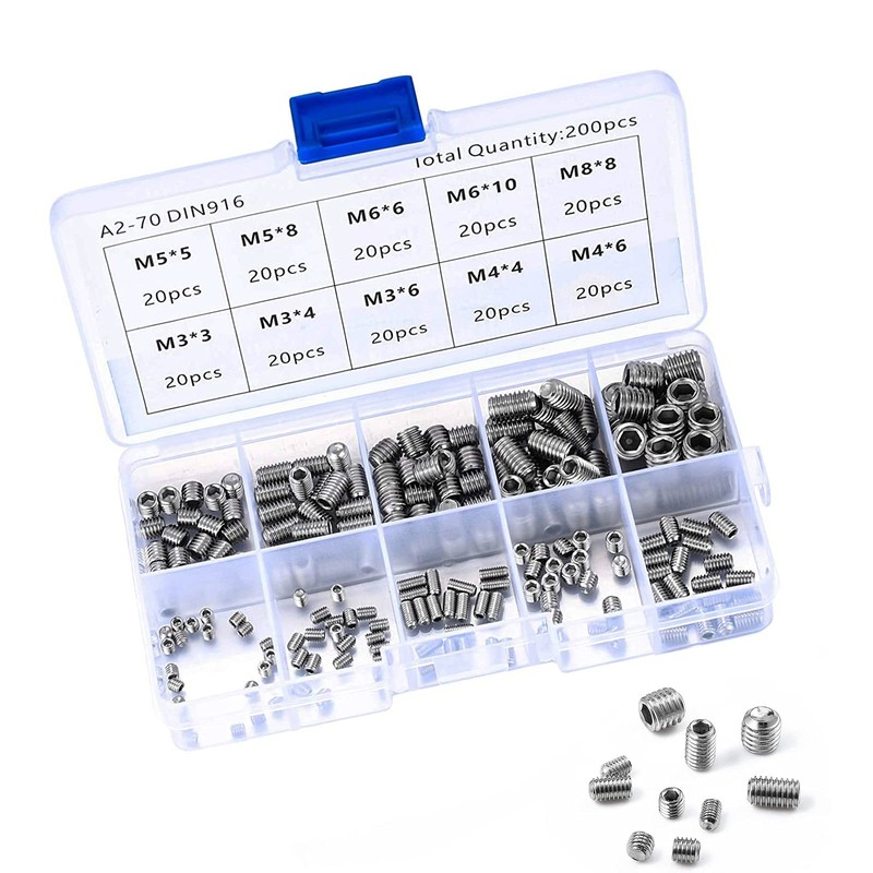 • Various sizes: this threaded screw includes 10 different grub screws, total 200 pieces: M3 x 0.5 x 3 mm, M3 x 0.5 x 4 mm, M3 x 0.5 x 6 mm, M4 x 0.7 x 4 mm, M4 x 0.7 x 6 mm, M5 x 0.8 x 5 mm. M5 x 08 x 8 mm, M6 x 1 x 6 mm, M6 x 1 x 10 mm, M8 x 1.25 x 8 mm. The different sizes can better meet your needs.