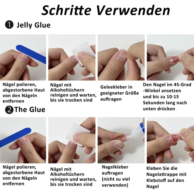Jelly adhesive stickers make false nails reusable, glue does not. We recommend that you use the jelly glue a few times first and use the glue last. The nail glue ensures that the false nails stay on your nails longer.