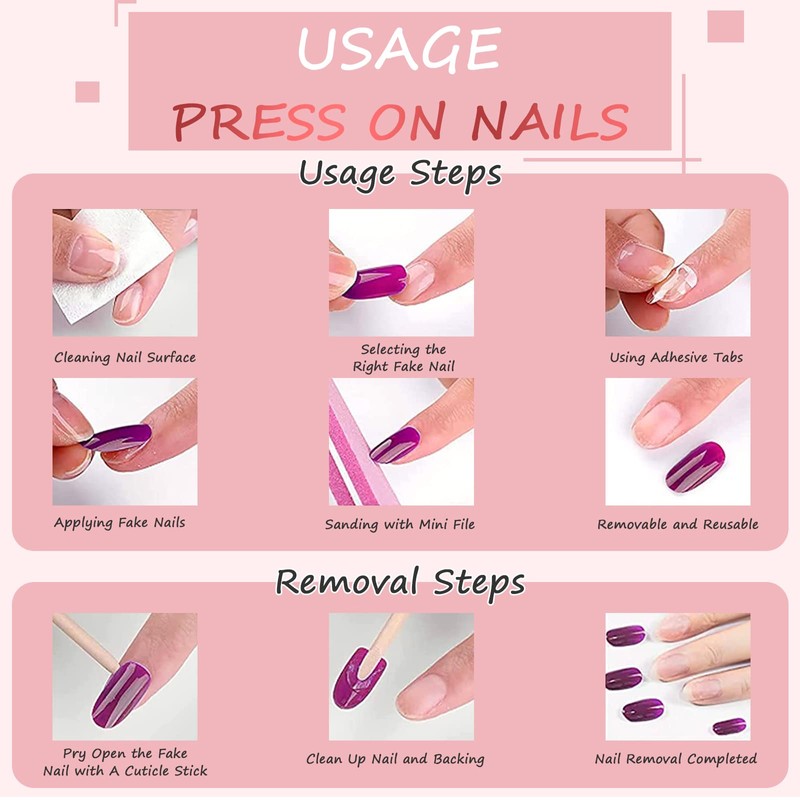 - Minimal installation: false nails to stick on with designs, simply choose the nail piece that suits you, polish the nail bed, stick the jelly glue we give as a gift, and press trendy nails for 30 seconds to get the natural manicure that girls like. Instead of spending a lot of time and money in the nail salon, you can change your nail style anytime and anywhere.