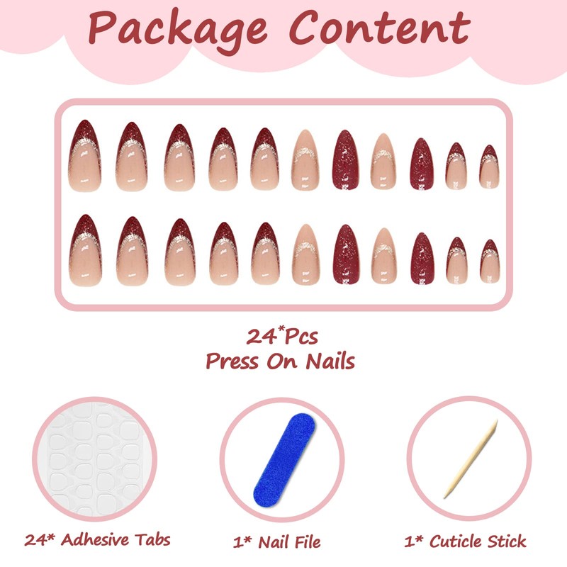 Pack of 24 False Nails, Almond Short, Red Glitter Nails for Sticking, French Tip Artificial Nails, Press on Nails with Design, Acrylic Artificial Nails, Fingernails, Fake Nails for Women and Girls