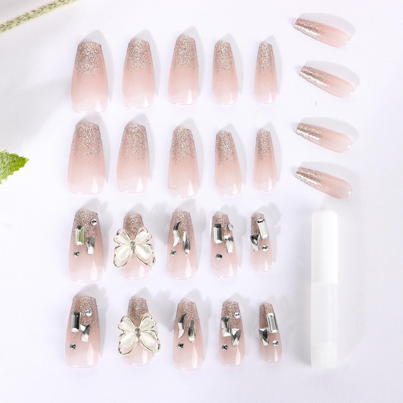 Pack of 24 Glue-On Fingernails, Glitter Butterflies Plant Pattern Press on Nails Set, Reusable False Nails for Women, DIY Nail Salons