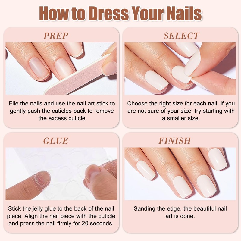 - Easy to use: get your favourite manicure in just a few minutes, anytime and anywhere. Suitable for anyone who loves beauty but don't have time for long salon visits. Simply clean your nails, choose the right size, apply the jelly glue, press for 20 seconds and enjoy flawless nails without drying time.