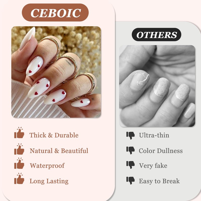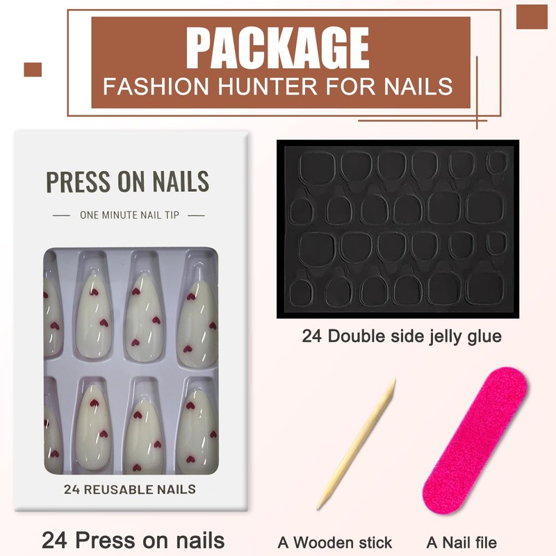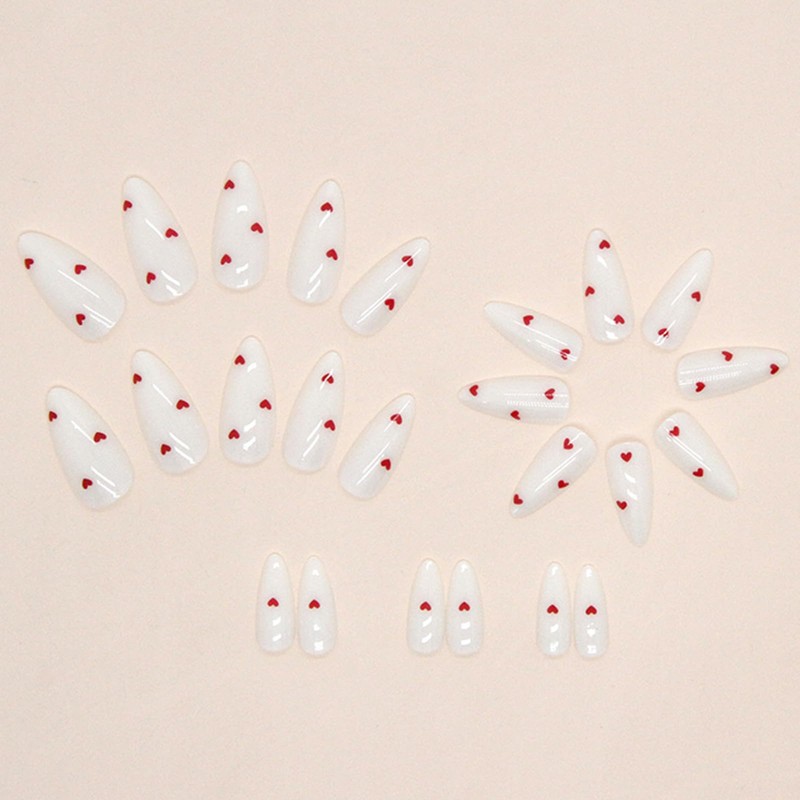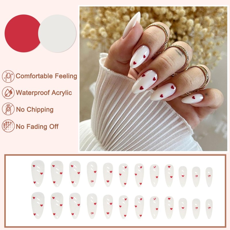 Pack of 24 Stick-On Nails Almond, French Press On Nails, Milk White Artificial Fingernails for Sticking with Red Love Design, Plain Artificial Nails, Acrylic Full Cover False Nails for Women
