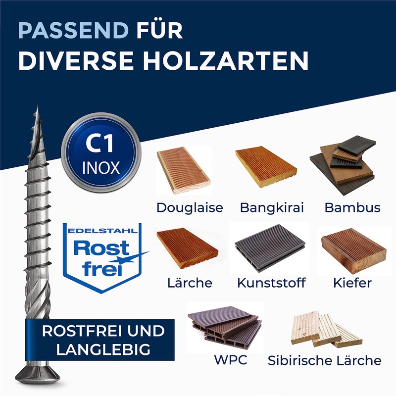 - Perfect for ash, larch, bangkirai, douglaise, bamboo, gerutu, ipe, lapacho, iroko, kambala, kaput and walaba. Screws for decking boards with material class C1 are characterised by their durability and very high strength. The stainless steel wood screws have a tensile strength of 1100 N/mm² and have the highest standards. Wood screws ideal for commercial users as well as for hobby screwdrivers.