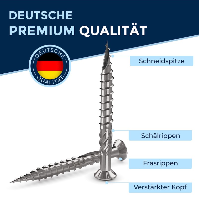 - For professional installation, pre-drilling and countersinking of the wooden planks is recommended - especially with very long screws. By countersinking the stainless steel screws Torx flush is possible. The friction thread on the patio screws prevents creaking noises on the patio, as the shaft moves in the wood with a little more play, with less friction. The correct length of the wood screws should be approx. 2.5 x the thickness of the wooden slats.