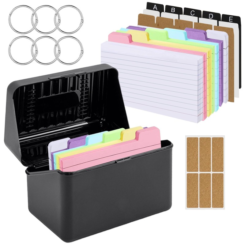 Index box black, pocket labelled lines index box including 180 coloured index cards with holes, 50 white index cards lined, 5 index cards from A-E, 5 white cardboard indexes, 5 kraft tabs, 6 binder rings and 6 kraft paper stickers, index box learning box, index cards box, for on the go learning notes school supplies office home.