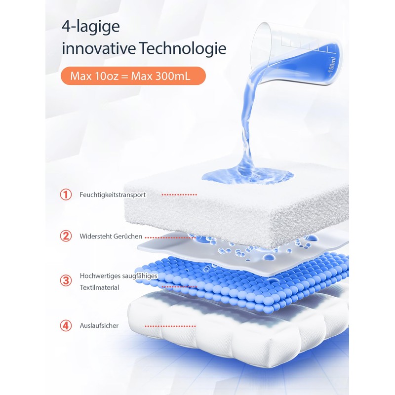 - Four layer absorbent structure: drainage layer/backflow protection layer/water absorption layer/leak-proof layer. They ensure that the urine does not leak and thus provide multiple protection