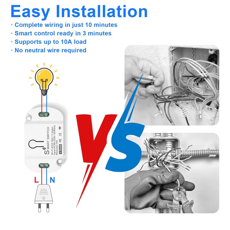 • Mini WLAN switch – quick and easy installation: unlike other smart light switch module solutions, our Alexa light switch requires no complicated wiring. It is enough to connect it to the phase (L) and the neutral conductor (N). In addition, it supports both surface-mounted and flush-mounted mounting - a real smart light switch for any living situation.