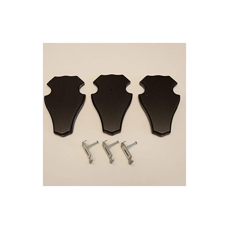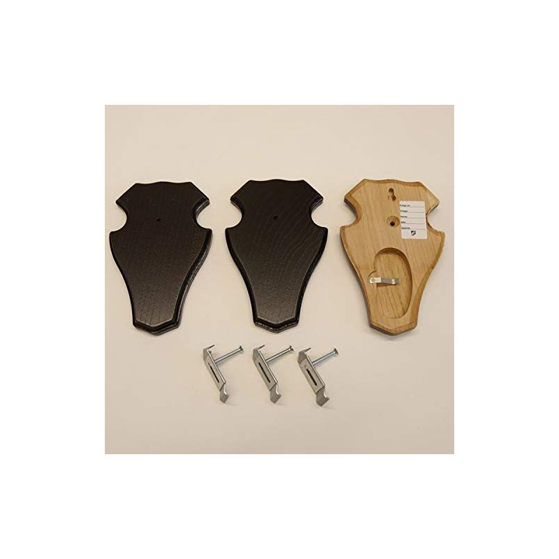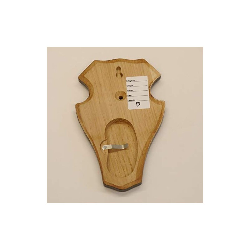 • Pack of 3 trophy signs for deer antlers made of solid oak wood – dark oak – the back: pine compartment with retaining clip, hole for ear clip, hanging device and data sticker (with possible information on: killing day, lawyer, territory, age and weight) including 3 pieces of ear clips for secure attachment of the hunting trophy
