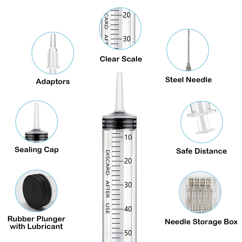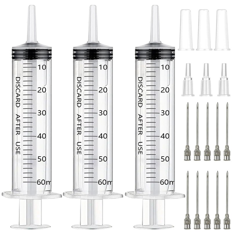 - Box contents: our products include 3 x 60 ml syringes, 3 x adapters, 10 x stainless steel needles. Each syringe is individually sealed and equipped with a sealing cap, making it cleaner and safer.