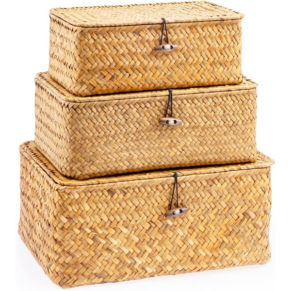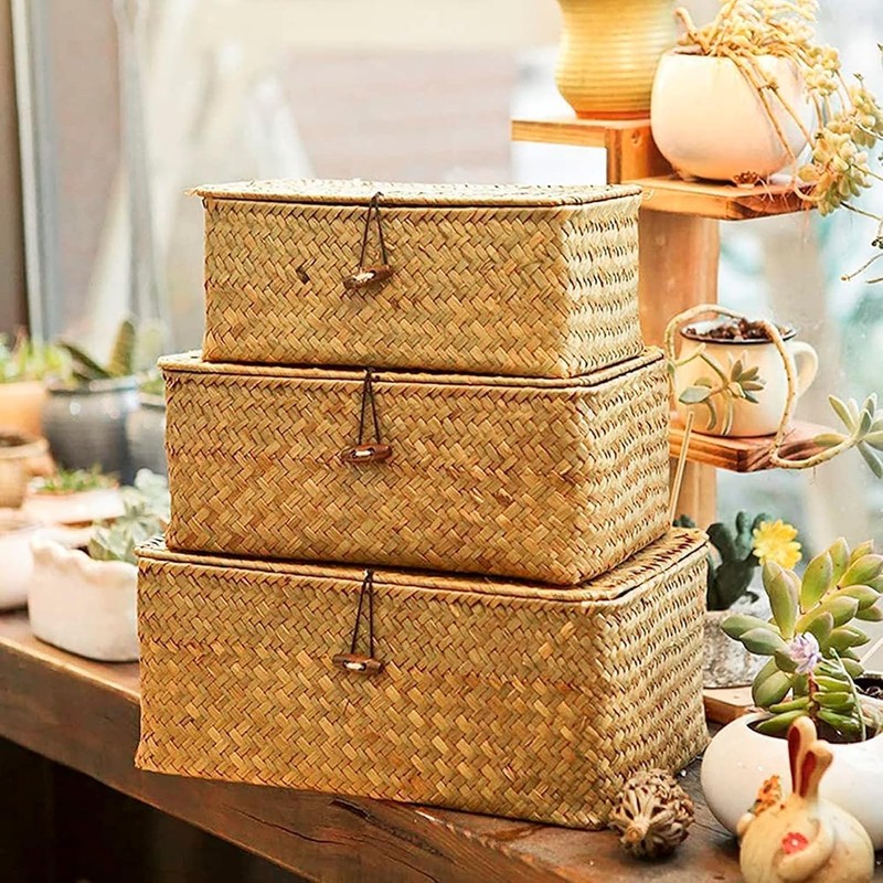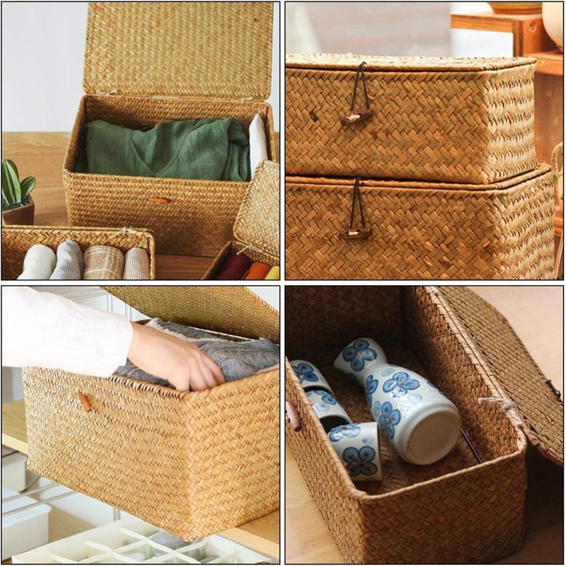 Pack of 3 Wicker Storage Baskets with Lid, Rattan Storage Basket, Woven Rattan Seagrass Braided Rectangular Storage Basket for Organising Rattan Retains