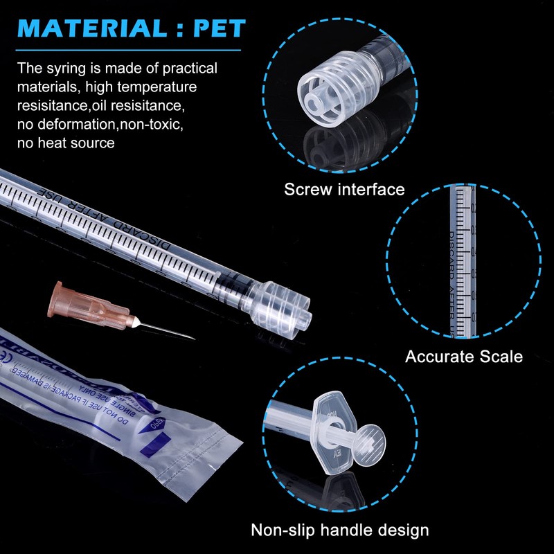 - High-quality materials: high-quality industrial grade polypropylene plastic, easy to squeeze/pull, safe and odourless. The needles have a good cut, so that the puncture is hardly noticeable.