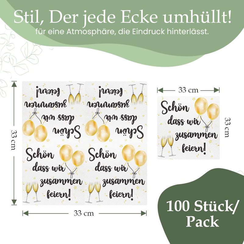 - With napkins 100 birthday you will receive a large pack of high-quality napkins, perfect for stylishly decorating your party table. The elegant design adds a special touch to any occasion, whether wedding, birthday or celebration, and creates a festive atmosphere.
