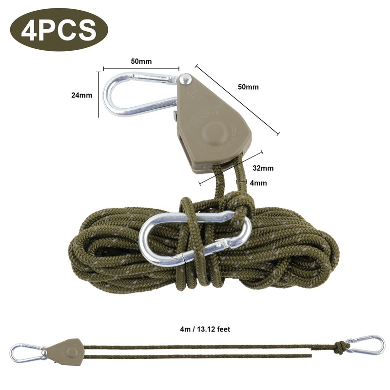 - Package contents: 4 pieces tent guy ropes with pulley (diameter 4 mm, length 4 m). Material: nylon, stainless steel, PPC, aluminium, 1/8 inch aluminium buckle; rope length: 13 ft / 4 m; weight capacity: approx. 260 kg / 573 lbs (per pair). This reflective guy ropes rope takes up little space in your backpack, but can be incredibly useful in an emergency.
