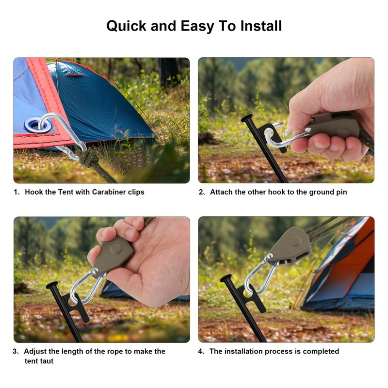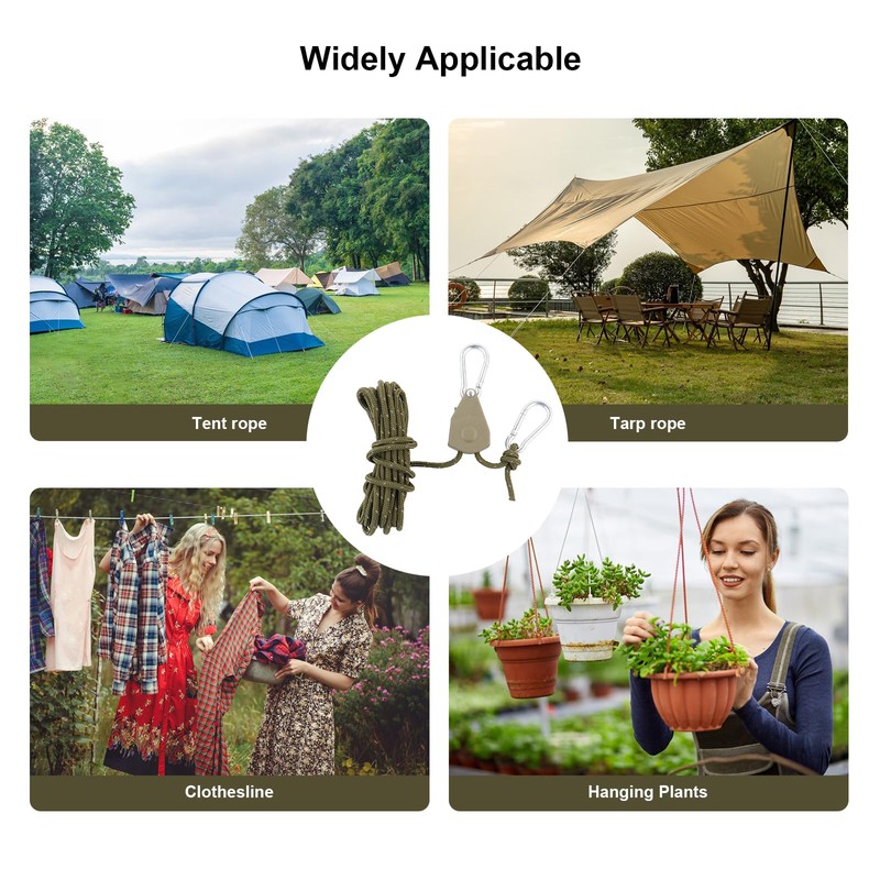 - Equipped with tensioners: Our camping tent cord for trekking is equipped with tensioners that are designed with pulleys. After threading the rope through the zinc alloy pulley, the rope is tight to hold the tent, tarp or awning. With this tensioner, the rope length can be varied and tightened as needed (does not slip away).