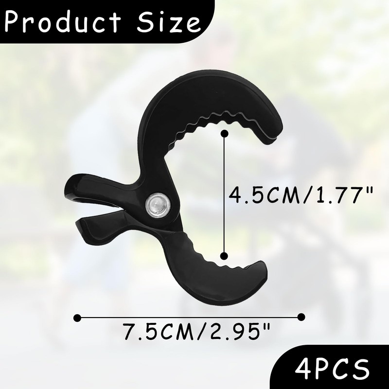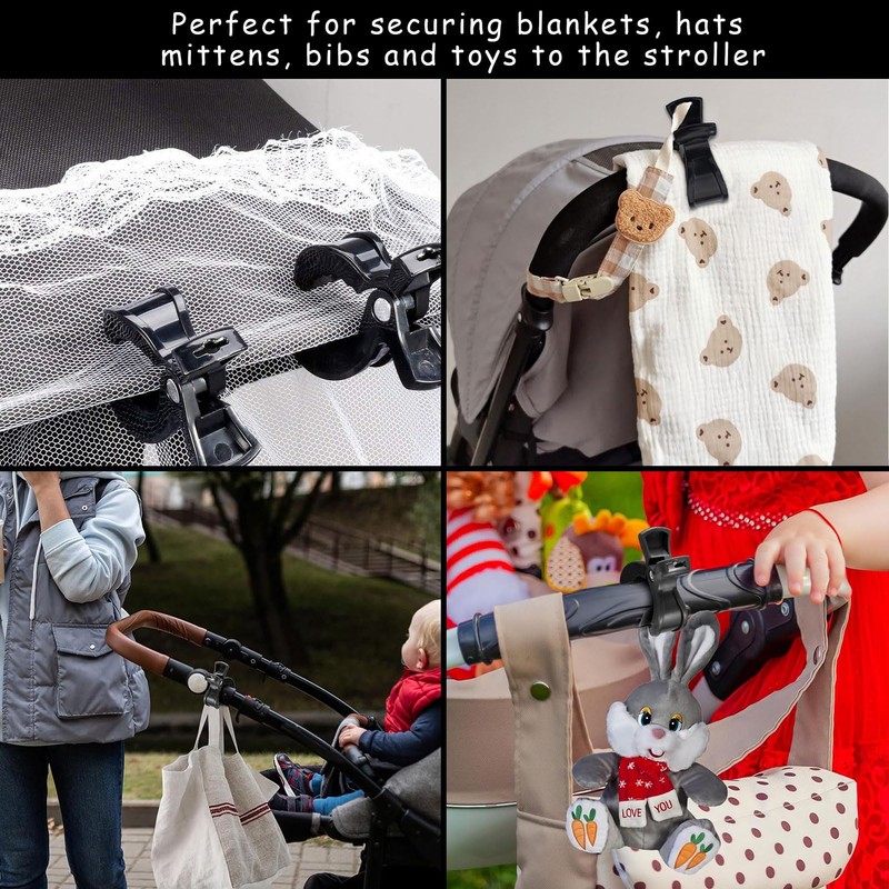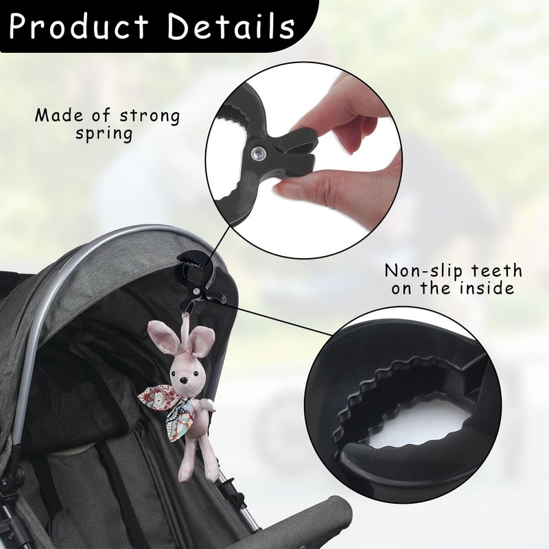- Better Fixation The stroller hook is flexible, not easy to break, has better grip and stronger biting force. In combination with the matte texture of the product, pram clips fit better in the hand and are non-slip.