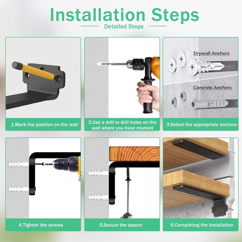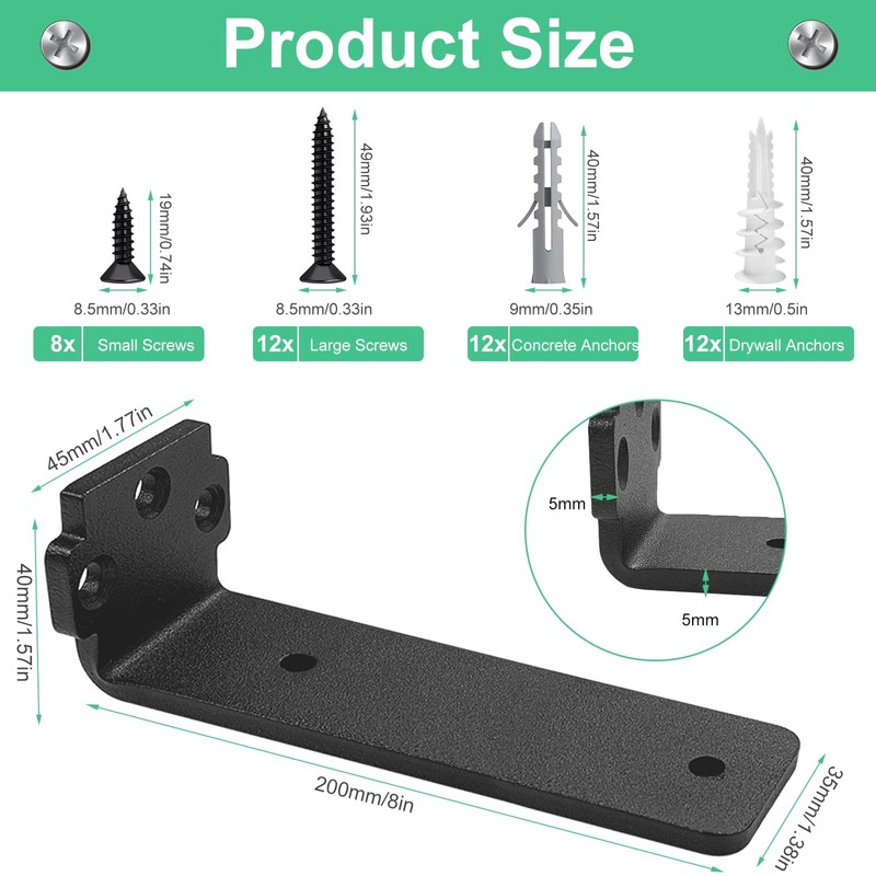 - Material features: shelf support has 5 mm thick material, can hold up to 70 kg, not easy to deform, the bracket is covered with black matte coating, which increases the friction between the wooden plate and the bracket, and is more waterproof, not easy to rust