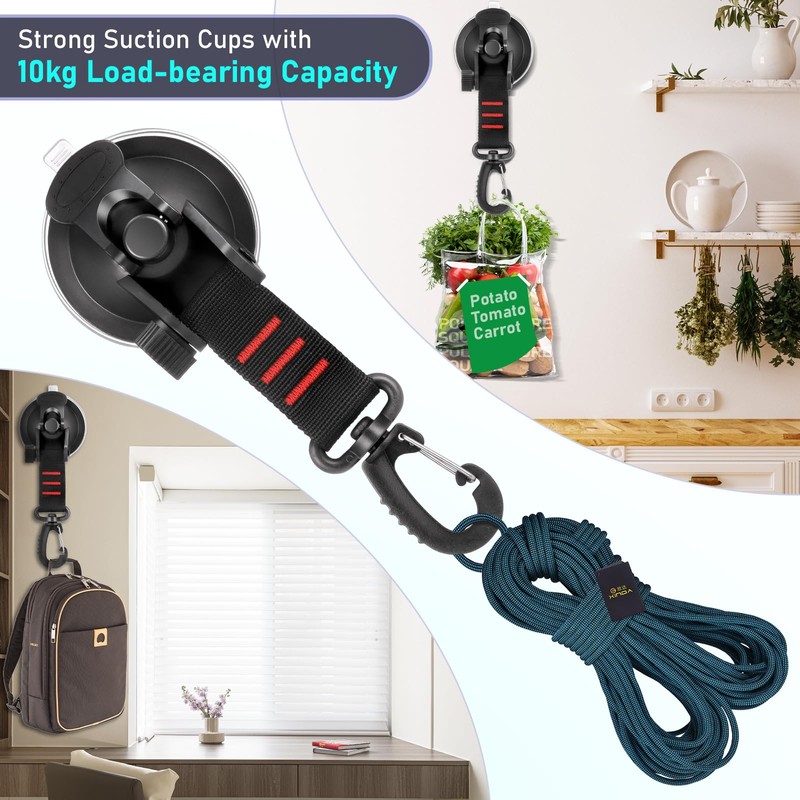 - 【Multi-purpose】These suction cups with hooks are ideal for attaching tents, awnings, parasols and tarpaulins to cars, suitcases or vans for outdoor camping. In addition, it can also be perfect for hanging things such as bags, kitchen utensils, lights, wreaths, plants and more. They fit on smooth and flat surfaces, such as ceramic tile, glass, mirror, stainless steel, etc.