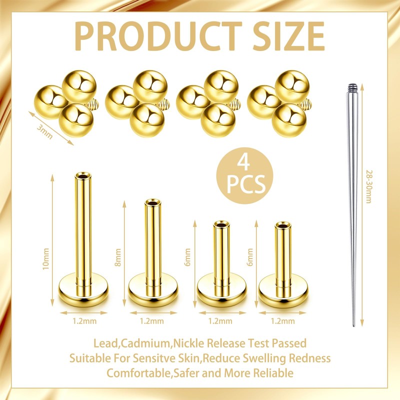 Pack of 4 Tragus Piercing Gold, G23 Titanium Helix Piercings, Gold Tragus, Internal Thread Labret Piercing, Gold Piercing, Tragus, Medusa Piercing, Lightweight, Comfortable to Wear, with Guide Bar