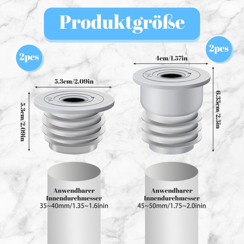 • Two sizes for optimal fit: washing machine drain adapter 53 x 53 mm for pipes with 35-40 mm inner diameter, 63.5 x 40 mm for pipes with 45-50 mm inner diameter, please measure your pipes before purchase so as not to buy unsuitable sizes