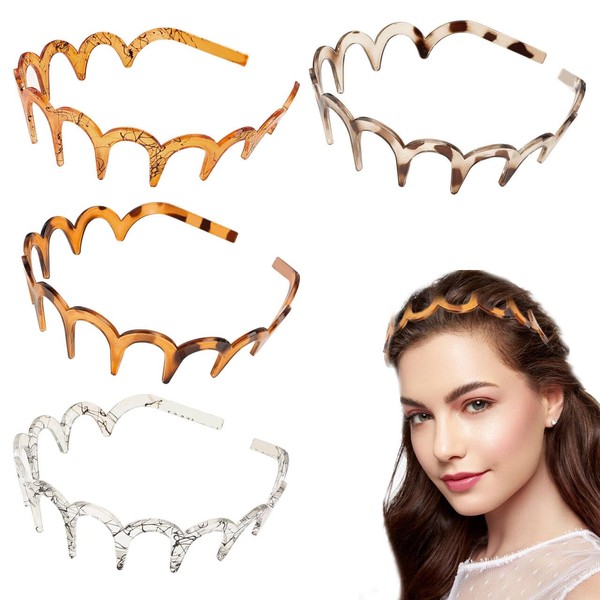 Pack of 4 Zigzag Headbands, Shark Tooth Hair Comb, Hard Headbands, Plastic Zigzag Headbands, Wavy (Tortoiseshell Brown, Tortoiseshell Grey, Snake Pattern Grey, Snake Pattern Coffee, 14 cm)