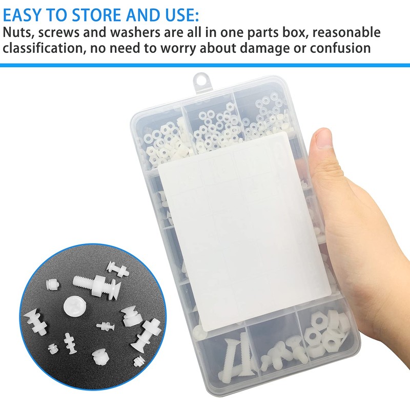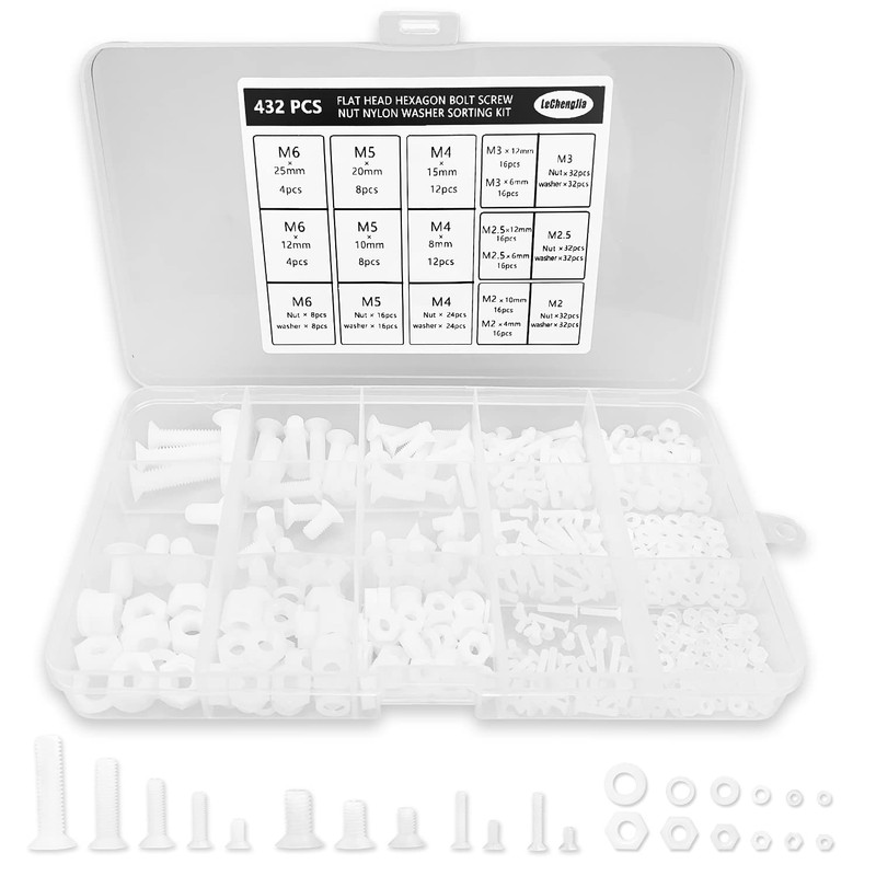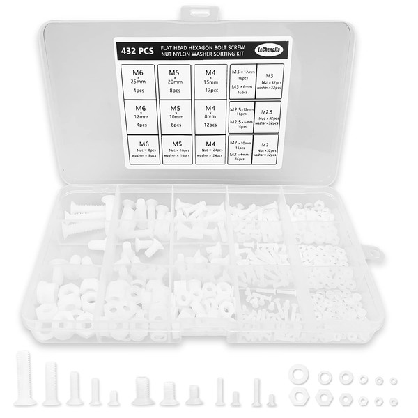 Pack of 432 Flat Head Hex Bolts Nuts Nylon Washers Sorting Set with a Plastic Box M2 M2.5 M3 M4 M5 M6 (White)