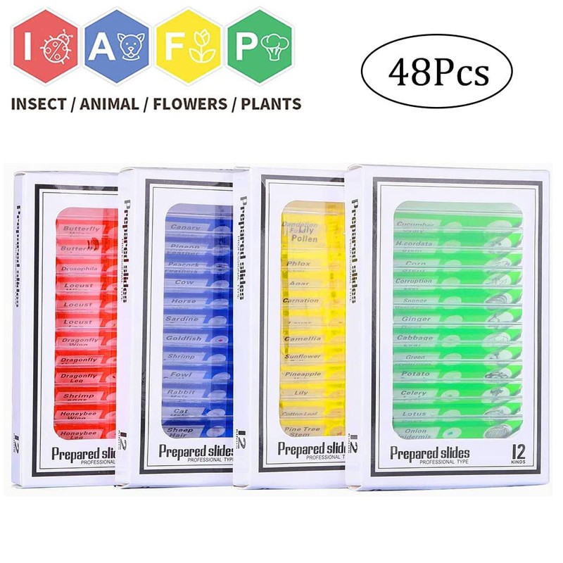 - Various content: microscope sample film comes in 4 boxes with 12 slides each. Covers different specimens. Red slide: insect part; green slide: vegetables; yellow slide: flowers and plants; blue slide: animals.