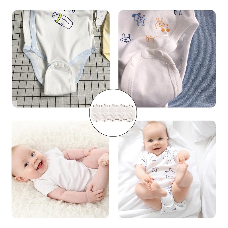 - With this set you will receive 5 high quality baby body extensions in white colour. Each extension is made from 100% cotton and features a double layer fabric construction with snap based connection. These practical accessories allow baby clothes to be adjusted in length and extend without having to buy new clothes.