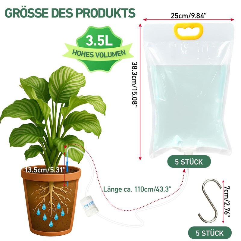 • 3.5 L long service life: a single bag full of water can hold a single plant pot for approx. 20 days (depending on the drip speed), so you don't have to worry about the plants running out of water when they are on business trips, on holiday or away from home for a long time.