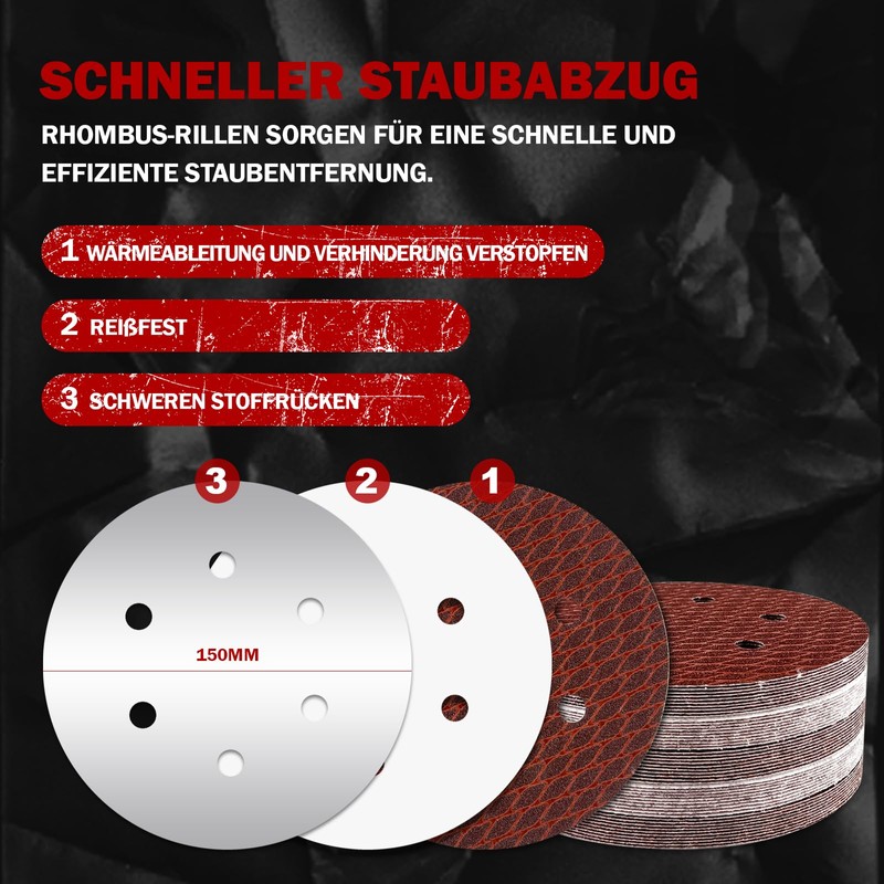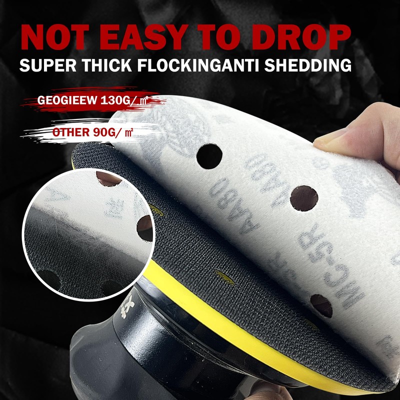 - High-quality material and long durability: our 50 pieces 150 mm sandpaper Velcro is made of high-quality material and is characterised by a long service life. Compared to other brands (95 g/m²), we use Velcro flocking (130 g/㎡), which ensures that the disc stays firmly on the sanding disc of the random orbital sander.