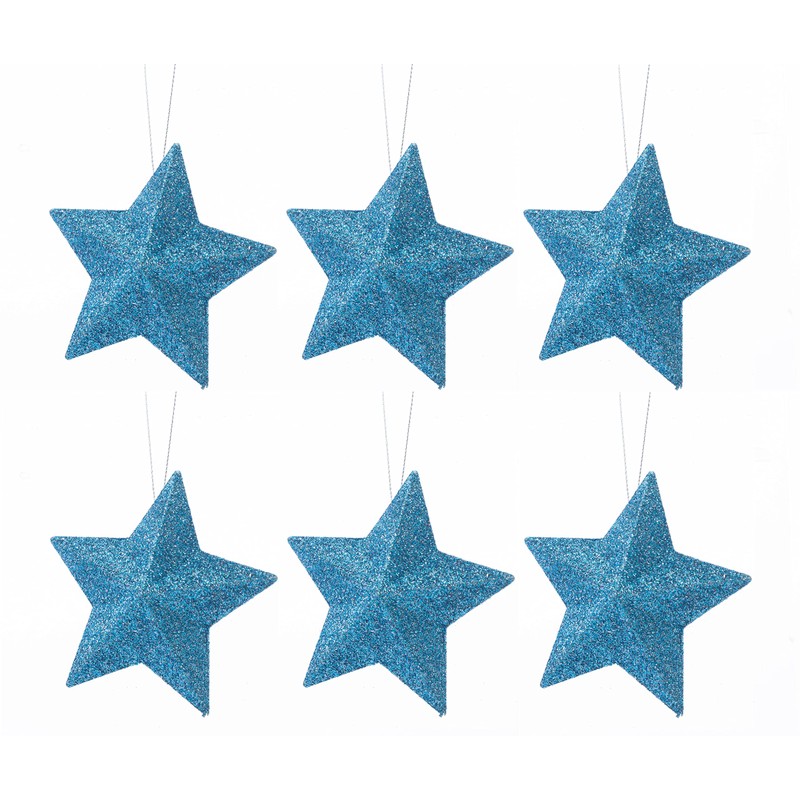 Pack of 6-8cm 3D Glitter Star Baubles Christmas Tree Decorations (Ice Blue)