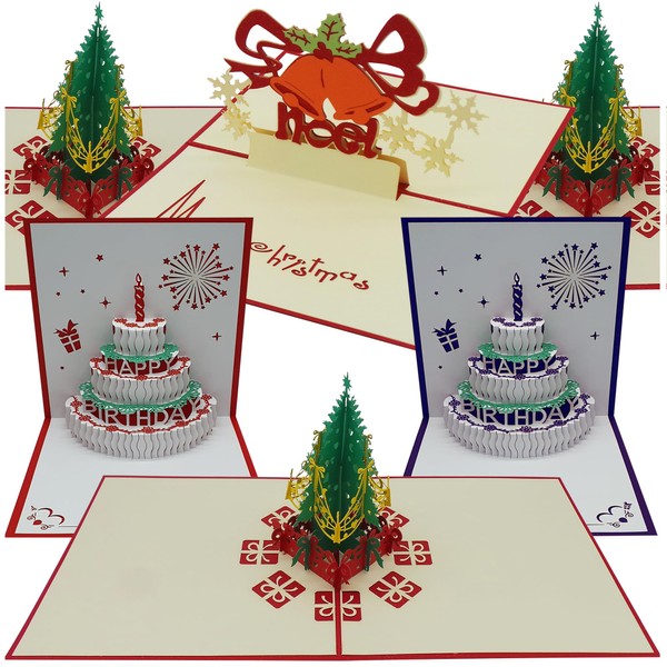 • Versatile Bundle for All Occasions: Includes 3 Christmas Tree cards, 1 Noel card, and 2 Birthday Cake cards (with red and blue covers) for Christmas and birthdays, ideal for parents, family, and friends.