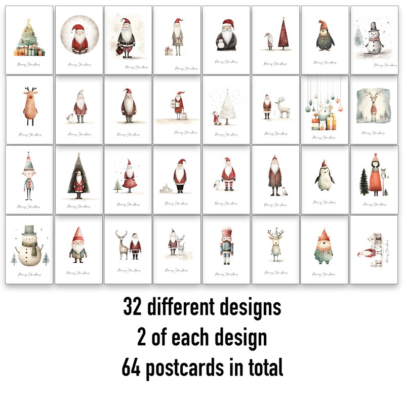 - Delightful Variety: Enjoy 64 unique designs, each capturing the festive spirit—from classic Santas to funny reindeers, perfect for everyone on your list. 32 different designs and 2 of each card, gives you plenty of choice.