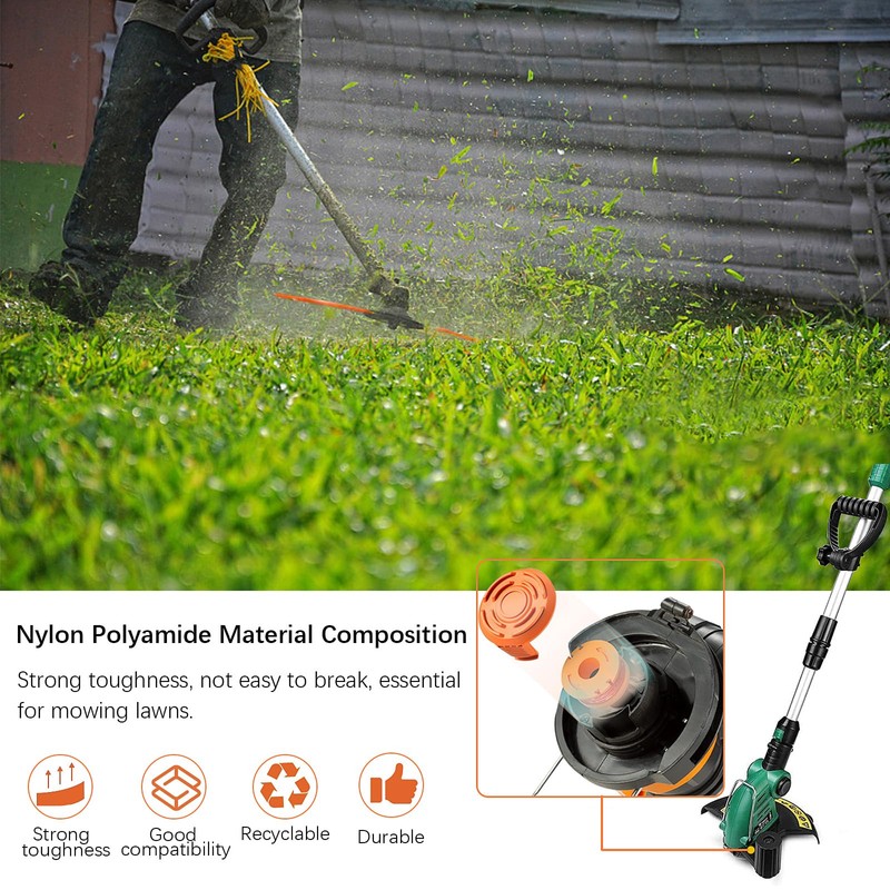 • Efficient cutting: the trimmer line spool adopts an elliptical aerodynamic shape, reduces air resistance, is flexible and flexible, so that the line can stretch and cushion on impact on hard surfaces, and increases cutting efficiency by 50%.