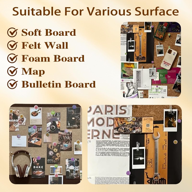 - Wide Applications These decorative push pins are suitable for various occasions, be it in the classroom, cozy home or busy office. You can easily attach photos, notes, information sheets, papers, DIY creations and much more. Also ideal for decorating notice boards, cork boards, foam display boards, cloth boards and for organising file folders. You can even hang newspapers, posters, reminders and cards to meet your diverse needs.
