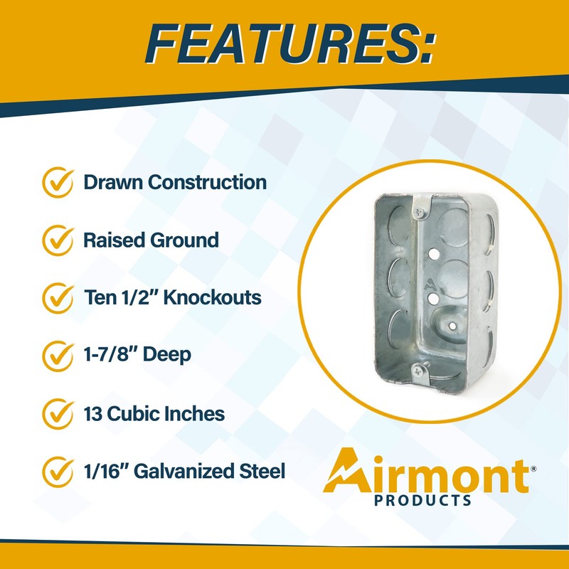 (Pack of Box and Cover) 4x2 Inch Utility Electrical Box, Outlet Box, Duplex Receptacle Cover, Drawn Construction, Ten 1/2 Inch Knockouts, Raised Ground, 1-7/8" Deep, 13 Cu. In. Capacity, Galvanized