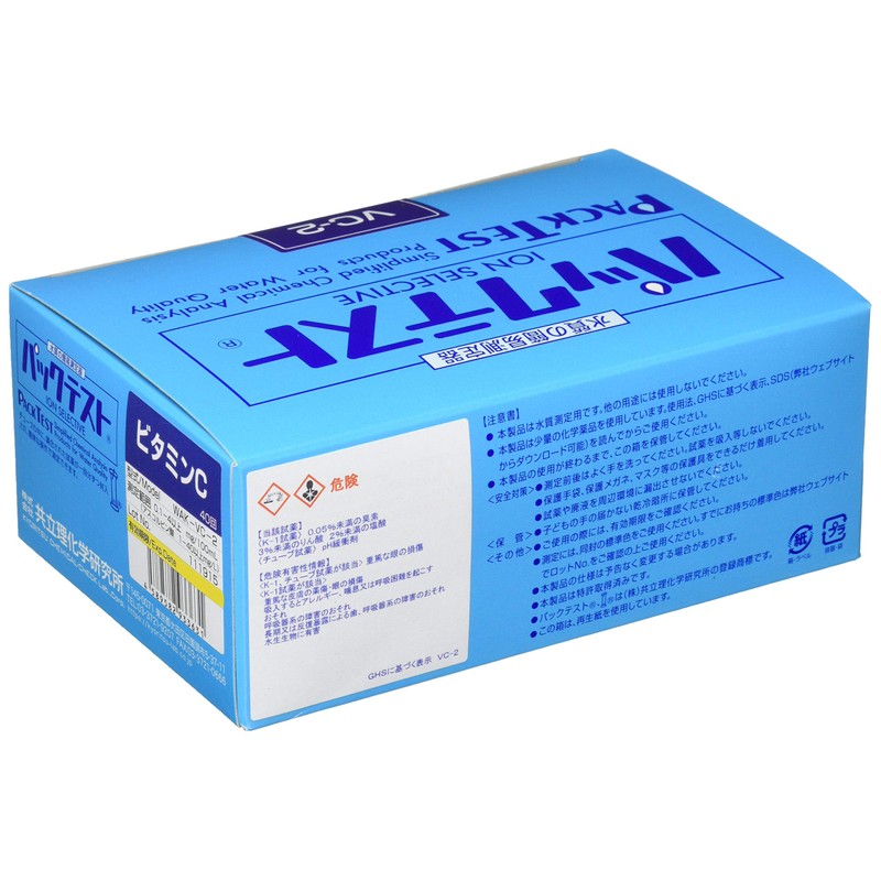 • Measurement items: Vitamin C (Ascorbic acid); Number of measures: 40; Measurement principle: Ferline-Denis ratio color; Measurement scale: << 0.1, 0.2, 0.5, 1, 2, 4 or more mg/100mL; 1, 2, 5, 10, 20, 40 mg or more Measuring time: 3 Contents: 40 tubes (8 bags of 5 laminate), 1 K-1 reagent (liquid), 1 dedicated cup, 1 standard color (with case), 1 instruction portion