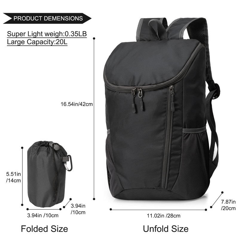 Benefited form its hight-quality material, this ultra-light bakcpack weigh only 0.35Lb. This could easily fold into compact size(a sandwich size of attached small pocket) while not in ues. A ideal travel compamy that could fit in your suitcase/handbag. An extra luggage for your need in airplane trip, avoiding overweight charge.
