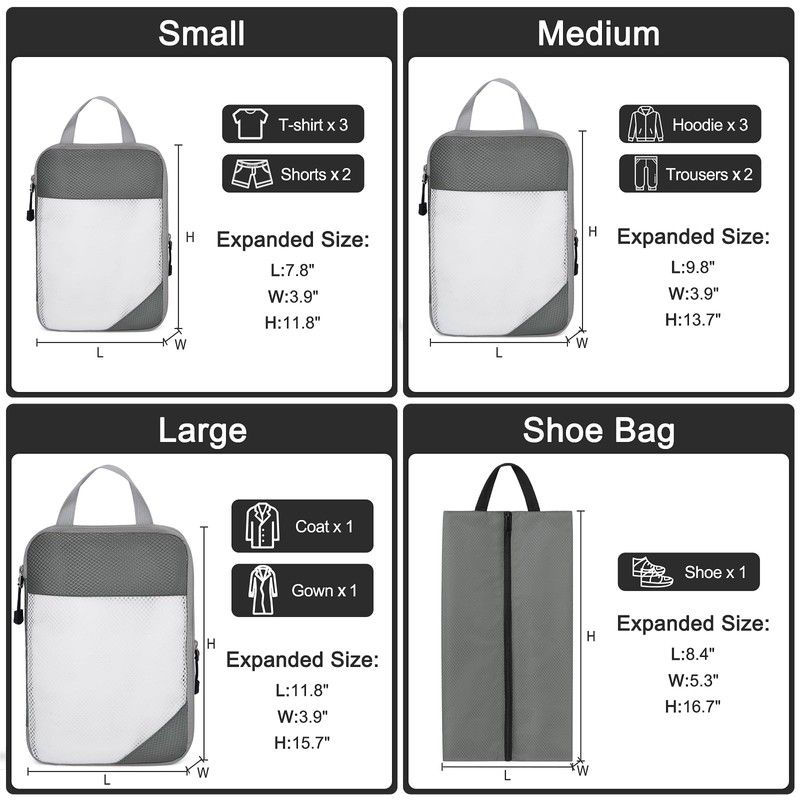 - 【4 Pcs Set Packing Cubes】 Simplify your search with our thoughtfully crafted 4-piece packing cube set, ensuring your clothes, accessories, and essentials are neatly organized and easy to locate. The expanded size(L*W*H,inches): L:11.8*3.9*15.7, M:9.8*3.9*13.7,S:7.8*3.9*11.8, shoes bag:8.4*5.3*16.7.