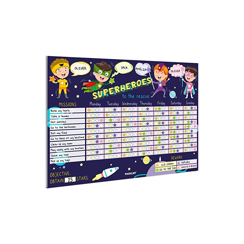 PACKLIST Reward Chart for Superhero Children. Kids Reward Chart, Learning Positively - Educational Weekly Calendar for Missions: Superheroes to the Rescue of Stars