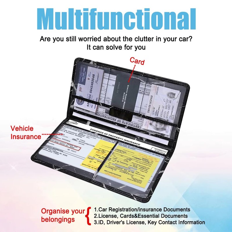 - [Storage function] : The internal design of the insurance and registration holder has a number of pockets, you can easily store your driver's license, registration card, business card, insurance card, ID card, bills and other items, to provide them with a reliable storage point, save important documents, so that they are no longer scattered around the car, not only convenient for you to find and use, but also effectively reduce the risk of loss. Is a very important car organizer.