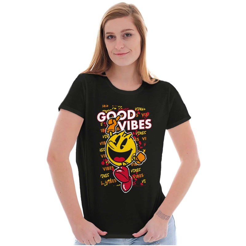 Pacman Game Good Vibes Graffiti Womens Top Junior Graphic Tee Black