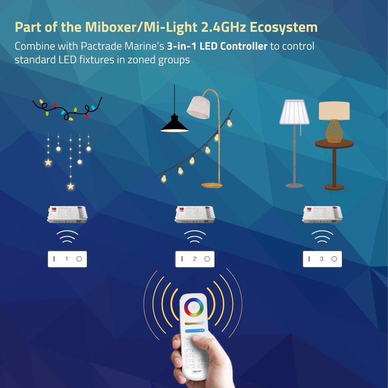 - Part of Mi-Light Ecosystem: Works exclusively with Mi-light 2.4G products like Pactrade Marine's 3-in-1 LED controller, which transforms standard 5-wire RGBW LED fixtures into fully controllable smart lighting able to receive Mi-Light commands