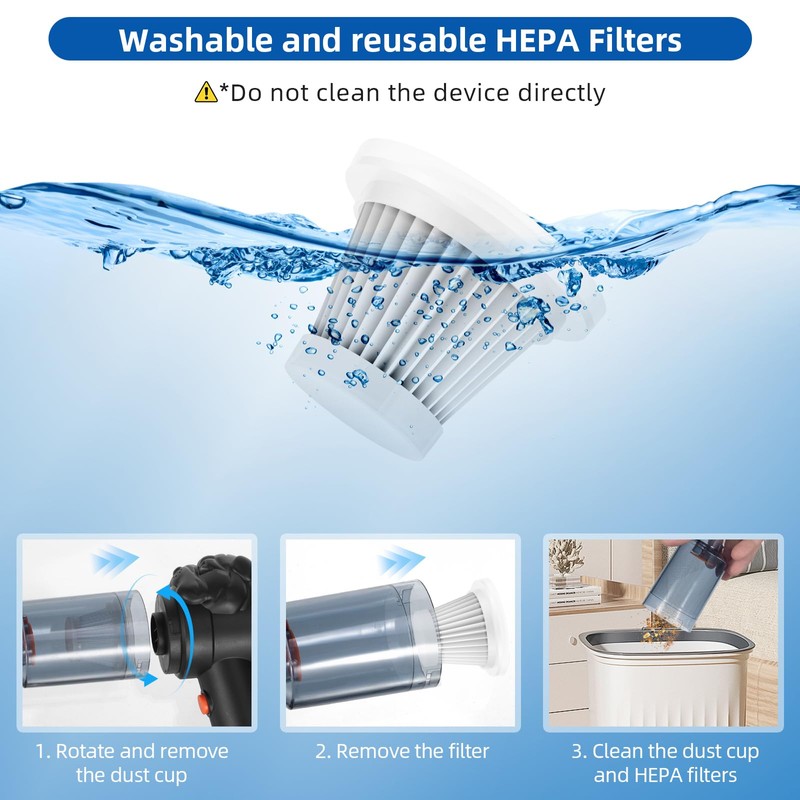 - Reusable HEPA Filter: The handheld vacuum cordless rechargeable model includes a removable and washable HEPA filter. This HEPA filter absorb tiny particles, ensuring the best cleaning strength. Maintain optimal cleaning efficiency with this vacuum cleaner for car and home, designed for sustainability