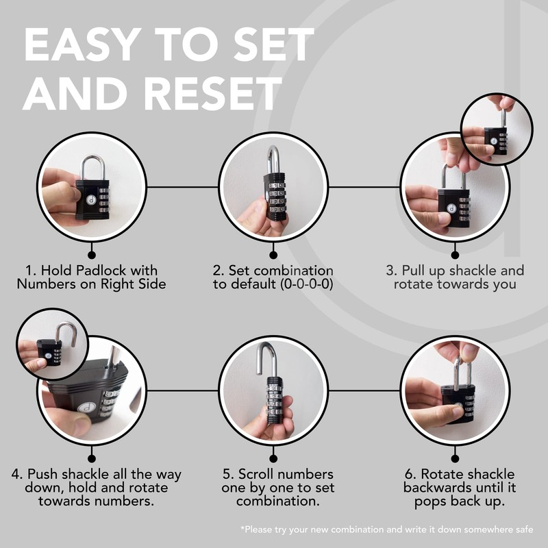 - Security Made Easy - Our combination pad lock is an easy to operate number lock. The 4 digit lock design allows you to easily set your own combination and is reprogrammable. It only takes seconds to program your new padlock combination.