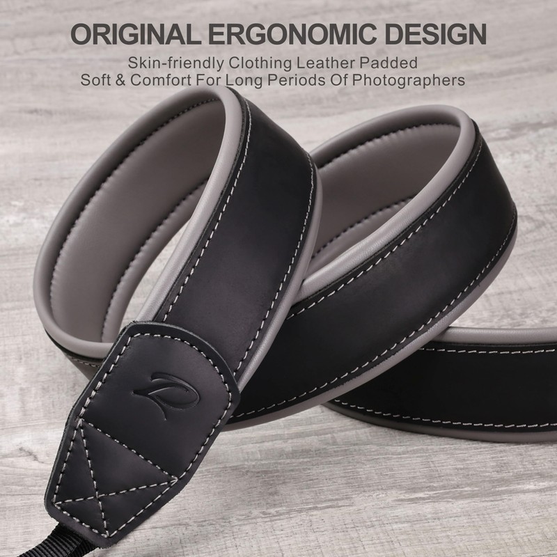 Padwa Lifestyle Black Padded Leather Camera Strap - Full Grain Genuine Cowhide Camera Straps with Gray Thick Skin-friendly Clothing Leather Padded,Soft&Comfort Strap for Long Periods of Photographers