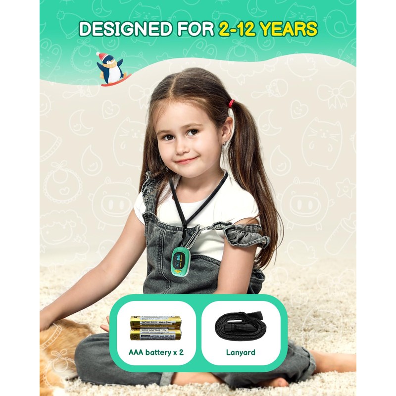 - Packing List: oxygen meter for kids x1, AAA battery x2, lanyard x1, User manual x1.