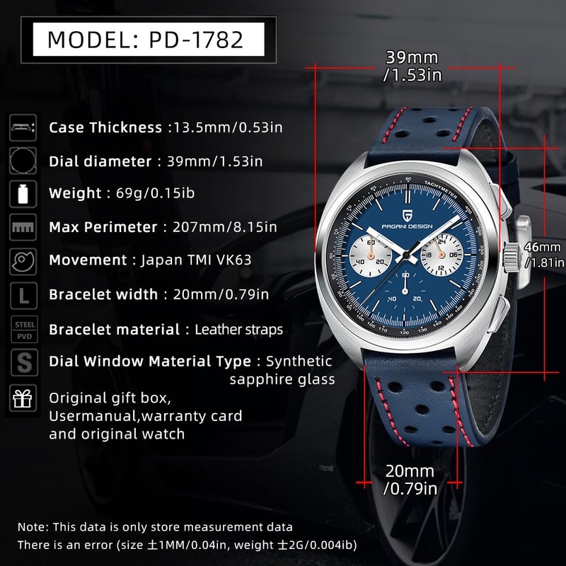 Pagani Design AR Sapphire Quartz Chronograph Vintage Dial Watch Leather Men's Watches Turtle Back Chronograph 1782 Men's Quartz Watch VK63 Movement, Blue Tape Q-1782, casual